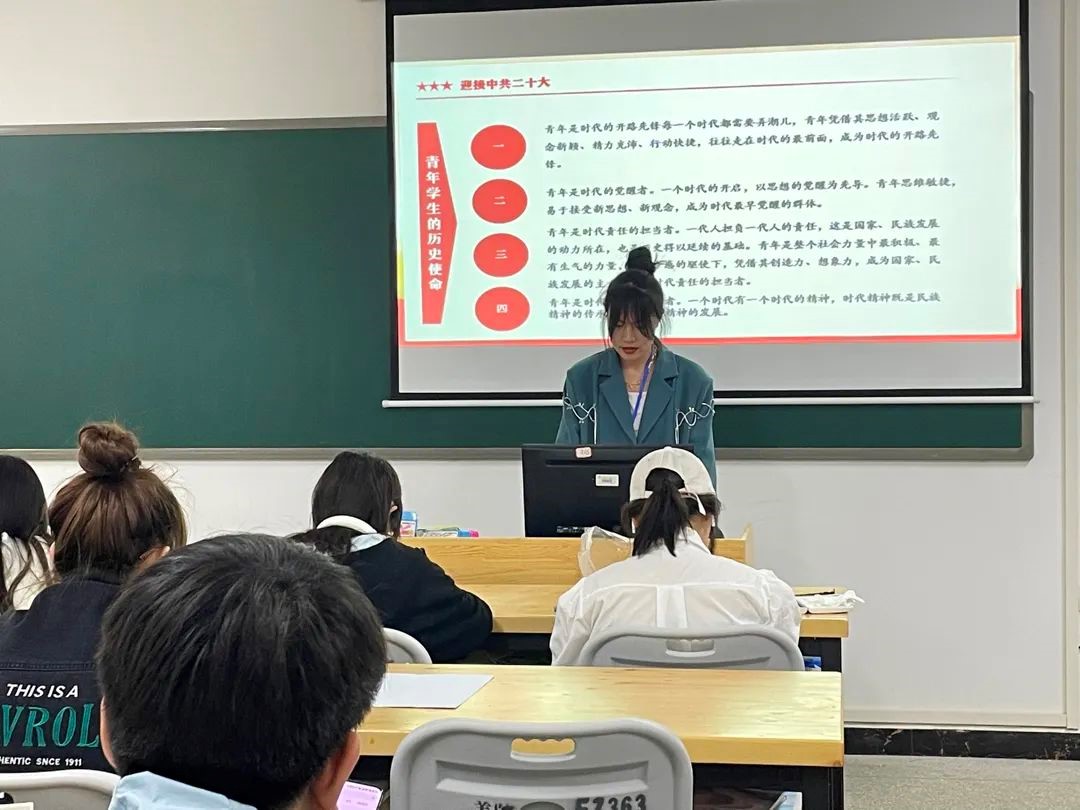 团总支学生会秘书处成员们运用PPT展示宣讲,为同学们生动详细地介绍了党的历次重要会议相关精神。宣讲内容紧扣主题,引导大家理解党的二十大召开的重要意义,了解党和国家的前进方向。增强“四个意识”、坚定“四个自信”、做到“两个维护”,为实现第二个百年奋斗目标、实现中华民族大复兴的中国梦凝聚起强大青春力量。