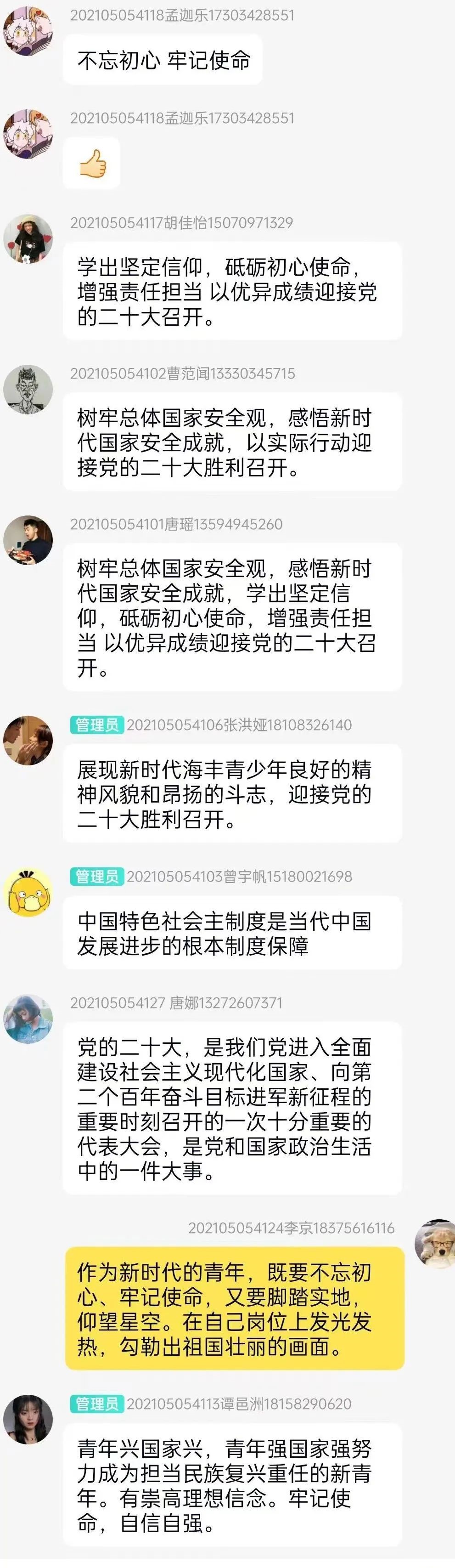 作为新时代的大学生,我们应该以青春热情饱满的姿态迎接党的二十大胜利召开,学习好宣传好贯彻好落实好党的会议精神,立志按照习近平总书记的希望与要求努力成长为新时代好青年!