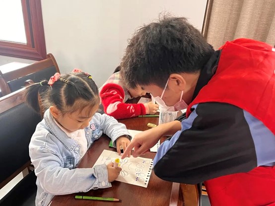 课堂上,青年志愿者们在整体教学过后对孩子们进行了分散的点对点指导,及时照顾每位小朋友。整个过程中,孩子们专注于描绘自己的作品画面,时而提出疑问,志愿者老师们便会在一旁耐心解答。