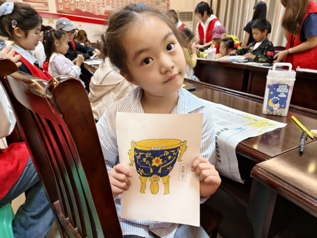 同日,天台社区的美育课堂则聚焦“金瓯永固杯”这一国宝级文物,详细讲解“金瓯永固”承载的国家统一、基业长青的美好寓意,以及其精湛的錾刻、镶嵌工艺。在绘画环节,帮助小朋友们理解传统图案的对称美与寓意美,不仅提升了孩子们的观察力和绘画表现力,更在心中播下了“保护文物、传承文化”的种子。