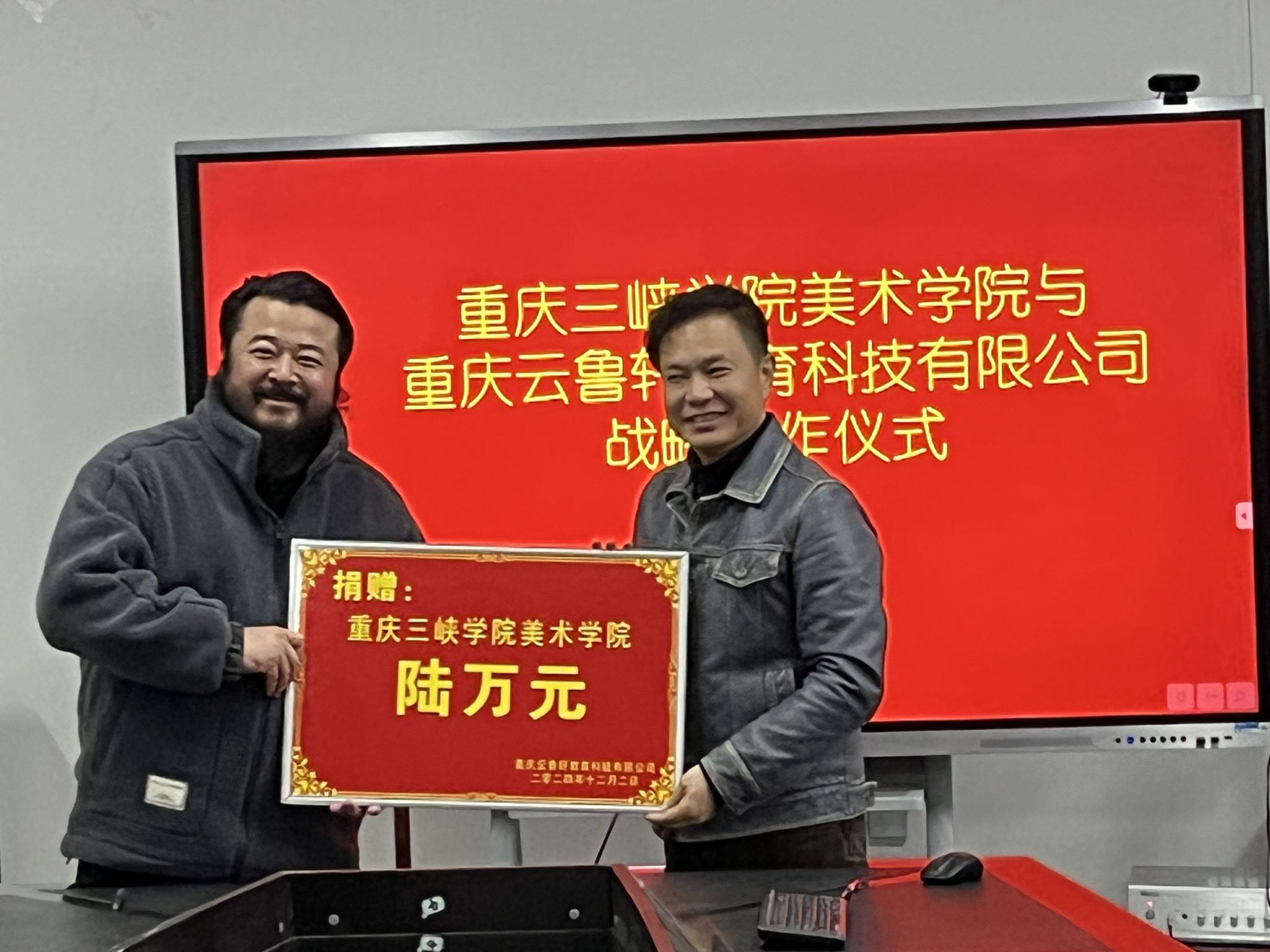 重庆云鲁轩教育科技有限公司向太阳成tyc7111cc捐赠陆万元,重点资助“重庆三峡学院太阳成tyc7111cc学生作品年展”,同时设立“鲁轩奖学金”。仪式上,张宏伟院长表示,此次合作是学院推进教育教学改革、提升人才培养质量的重要举措;田锋书记表示,与云鲁轩的合作促进了学院人才的培养,为学生就业提供大量岗位,重庆云鲁轩教育科技有限公司在课程开发、教学实践、师资交流等方面深度合作,共同打造美术教育新生态,为学生提供更广阔的学习平台和实践机会,培养适应时代需求的创新型美术人才。