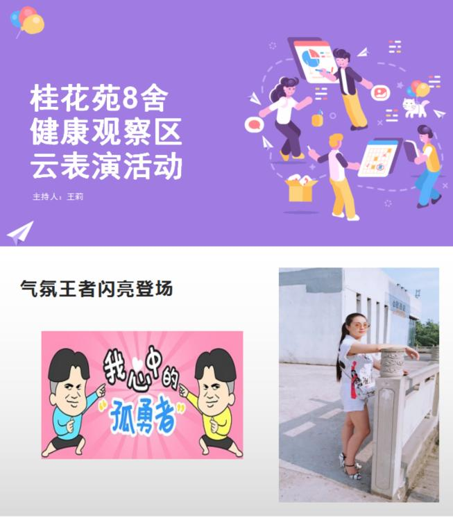 周末,王老师担心健康观察区的同学们心中压抑。于是她从现实条件出发,深入了解了每一位同学的心理状况并征询了大部分同学的意愿,在9月24日如期开展了“桂花苑8舍健康观察区云表演活动”。该活动以腾讯会议的形式开展,来自五湖四海的同学们齐聚云端,开始自己的表演。热情的学生,热心的宿管阿姨一起参与,云端十分热闹。虽然同学们不能离开房间,但是网络可以让我们更加紧密地依靠在一起,通过此次活动,大家的关系也更加亲近!