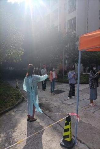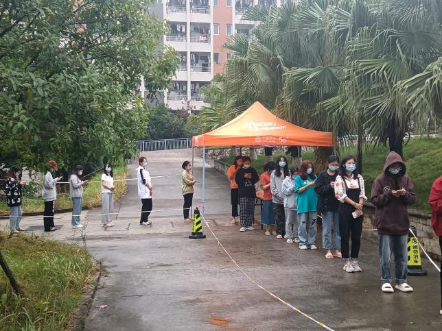 健康观察区的同学入住的第一、二、六天,需要她亲自带73名同学下楼做核酸检测并组织现场秩序。在健康观察区的那段时间,她每天早上7:30-9:00,晚上20:00-21:30,逐个走访寝室记录同学们的体温并挨个检查渝康码状态,起初出现了有些同学不会使用水银温度计等一些生活上的问题,王老师都会热心解决。